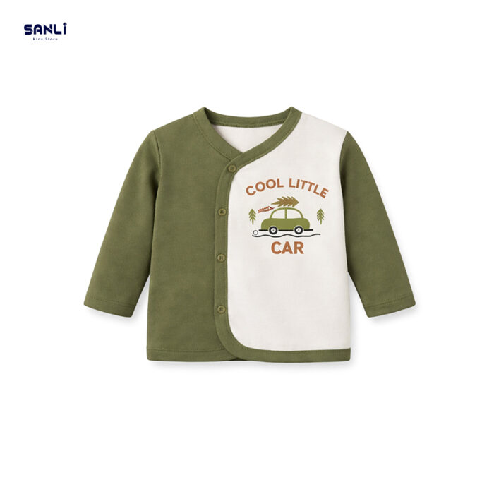 این لباس که در اصطلاحات تخصصی مد کودک به آن “Side-Snap” یا “Kimono Style” گفته میشود، نوعی پوشش بالاتنه است که فلسفه طراحی آن “پوشیدن بدون تماس با سر” است. برخلاف سرهمی نوزادی پسرانه که تمام بدن را پوشش میدهد و تیشرتها که باید از سر کشیده شوند، مانتو نوزادی ساختاری شبیه به کت دارد که دو لبه آن روی هم قرار گرفته (Double Breasted) و با دکمههای کناری یا مرکزی بسته میشود. این ساختار باعث میشود لباس آزادانه روی شکم قرار گیرد و هیچ فشاری به ناحیه حساس ناف وارد نکند. در مدلهای پسرانه، برشها معمولاً راسته (Boxy Cut) هستند تا استایلی مردانه و در عین حال راحت را برای نوزاد فراهم کنند.